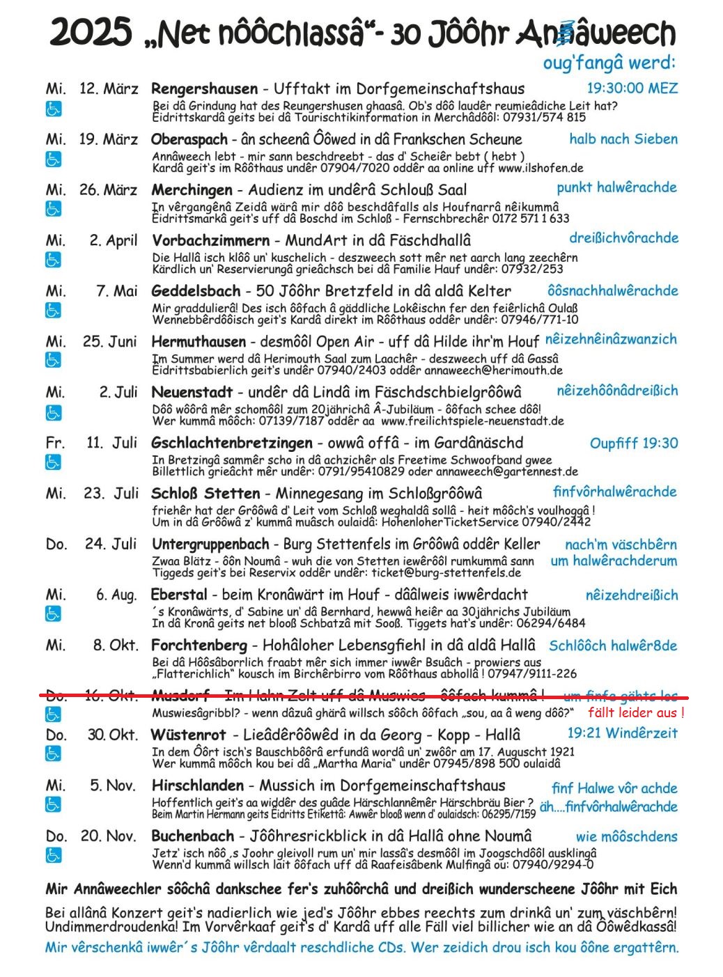 Achtung! Termin Musdorf am Do 16. Okt fällt leider aus! Mir wärâ gerâ dabei gwee. Nix fer uguât .....